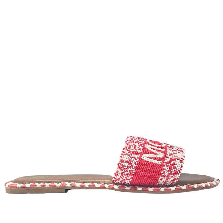 Monte Carlo beaded slides from DE SIENA SHOES featuring red, calf leather, bead embellishment, contrasting border, low block heel, branded leather insole, open toe and slip-on style.