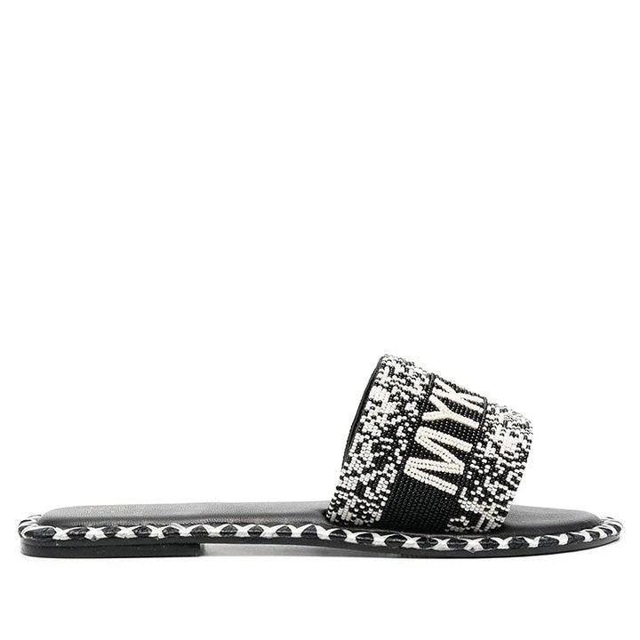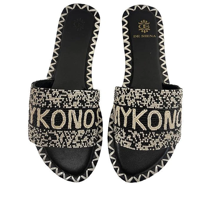 Mykonos beaded slides from DE SIENA SHOES featuring black/white, calf leather, bead embellishment, open toe, branded leather insole, low block heel, slip-on style and rubber outsole.