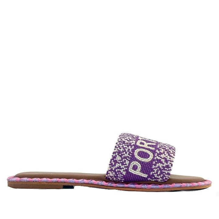 Sandal, De Siena, in leather, band with Portofino writing in purple and white beads, leather sole.