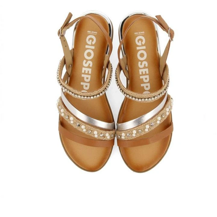 The perfect design for any occasion. Tan sandals featuring mini wedges and straps in leather and natural jute with decorative crystals and mini pearls. Adjustable fastening at the ankle. Leather insoles with latex cushioning for extra comfort. Flexible soles. Insoles made of leather produced in tanneries which follow a more sustainable tanning process in line with Leather Working Group standards.