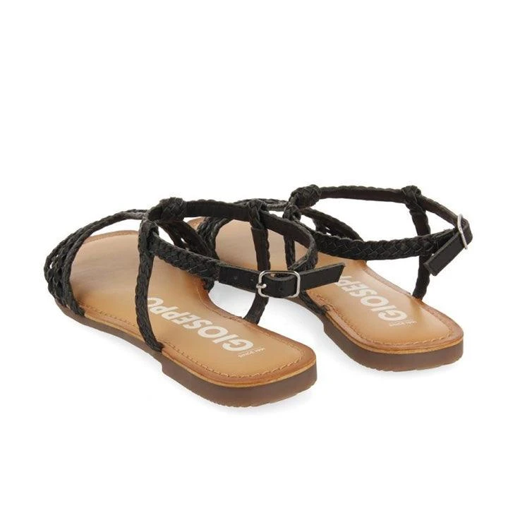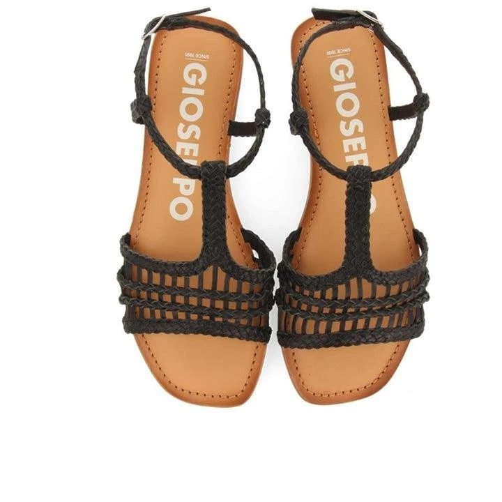 Black open sandals for women Gioseppo brand. The material used in its manufacture is various materials. The heel of this pair of sandals is flat.