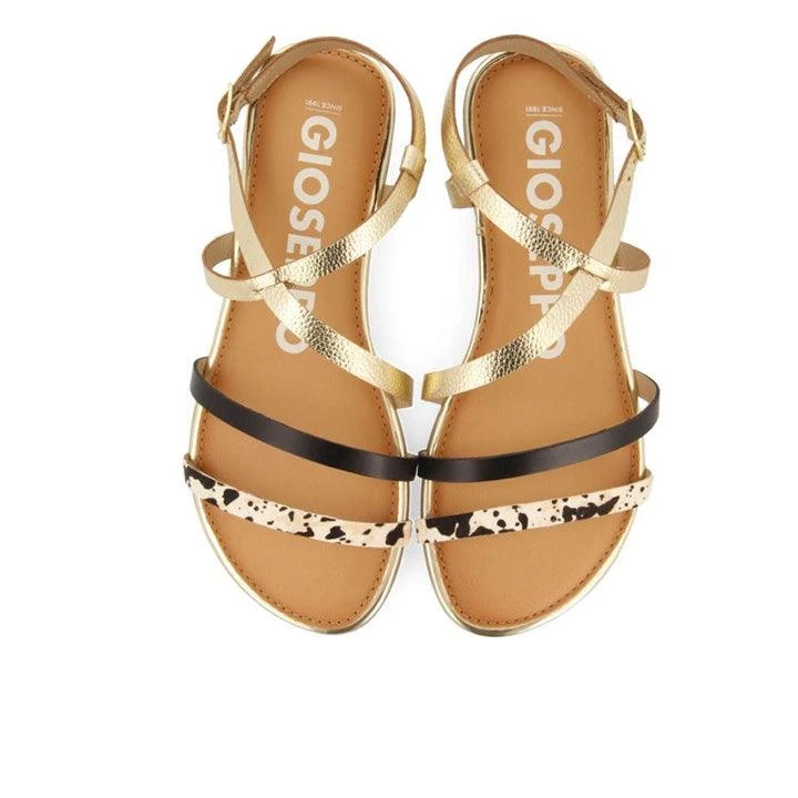 lat leather sandals with metallic gold straps and cow print. Buckle fastening at the ankle. Leather insoles with latex cushioning. Inner soles made of leather produced via a more sustainable tanning process in line with Leather Working Group standards. Very flexible soles to guarantee maximum comfort. You’ll never want to take them off!