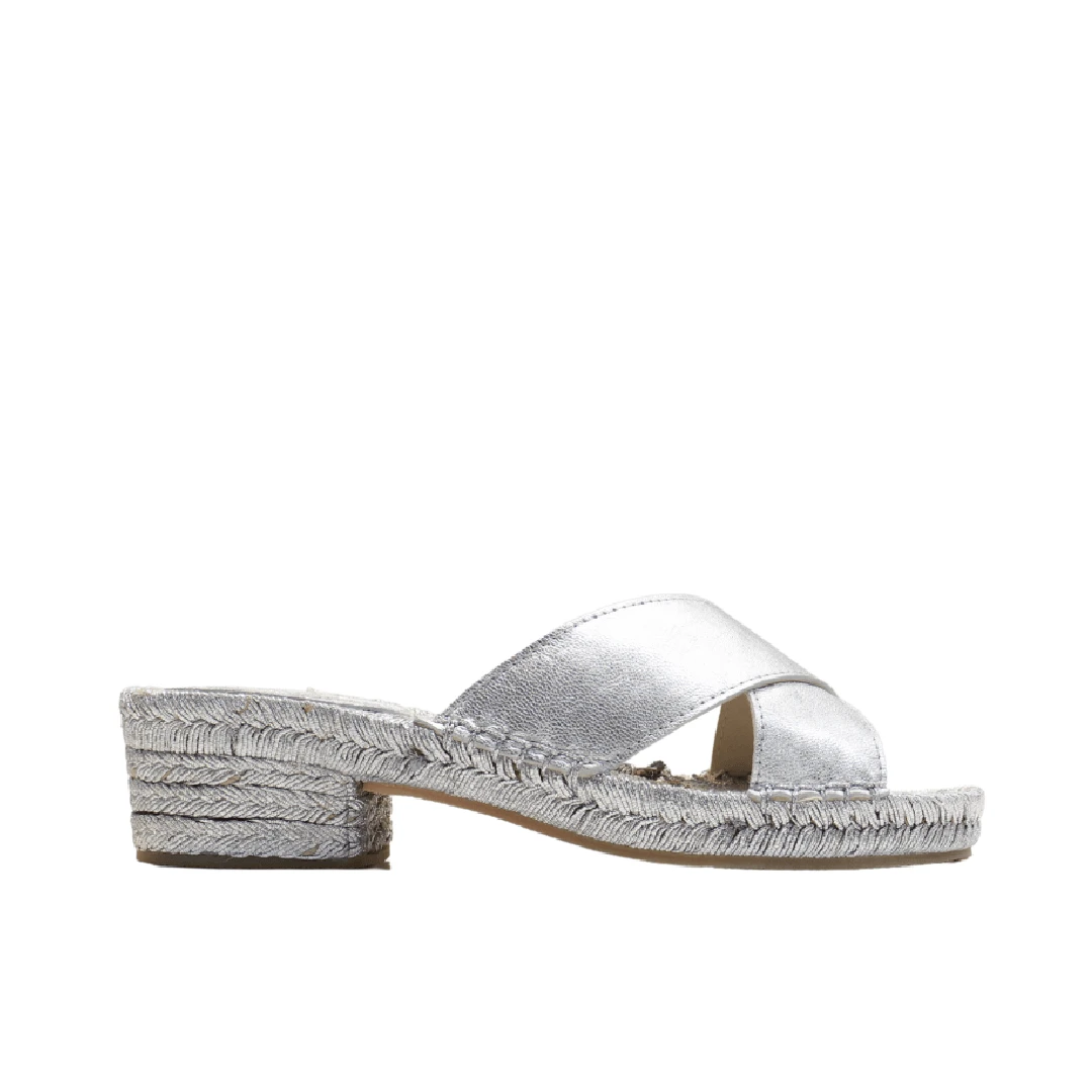 Wide, crisscrossing vamp straps boast a chic metallic finish on an espadrille-inspired sandal lifted by a braid-wrapped platform and low block heel.
