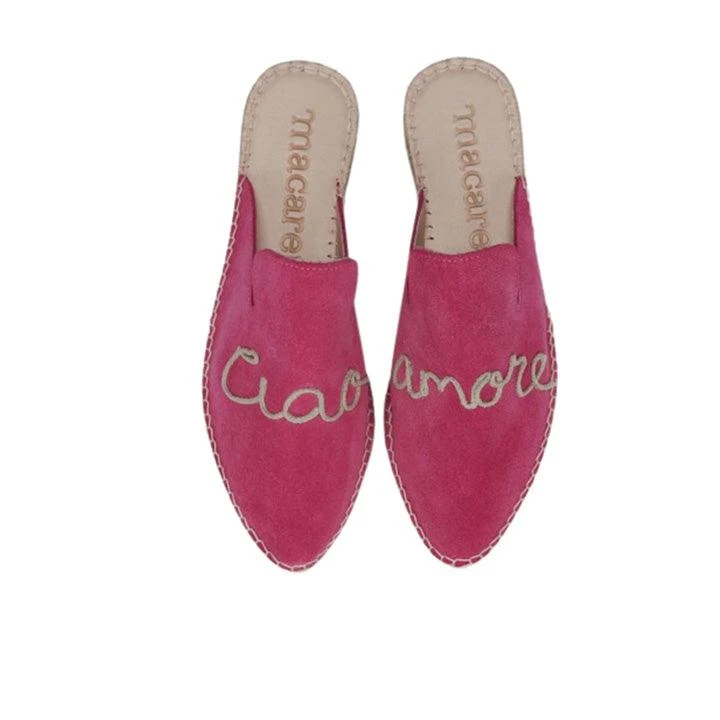 Flat espadrille made of suede color Fuschia with ‘ciao amore’ detail embroidered in color ecru. Pointed toecap. Height 2cm. Handmade in Spain.